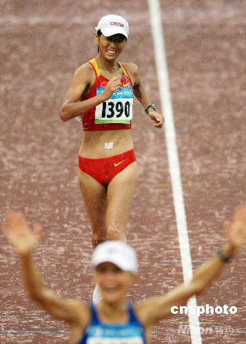 北京奧運(yùn)會女子20公里競走8月21日上午在大雨中舉行,中國選手劉虹最終成績?yōu)?小時27分17秒,名列第四,無緣獎牌。中新社發(fā) 任晨鳴 攝