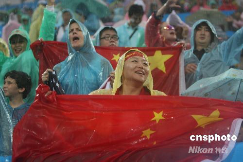 8月21日,中國選手田佳、王潔在奧運(yùn)沙灘排球決賽中以0 :2負(fù)于美國選手克麗·沃爾什、米絲蒂· 梅—特雷納,獲得亞軍。圖為觀眾冒雨為運(yùn)動(dòng)員助威。中新社發(fā) 武仲林 攝