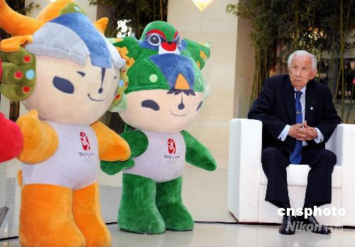8月21日,國際奧委會(huì)終身名譽(yù)主席薩馬蘭奇攜手福娃在北京奧林匹克公園展示中心參加活動(dòng)。中新社發(fā) 王東明 攝