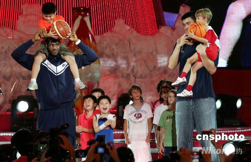 8月21日,中美兩大炙手可熱的籃球巨星姚明和詹姆斯亮相北京世貿(mào)天階奧運(yùn)文化廣場,與民眾一同歡度奧運(yùn)會(huì)的美好時(shí)光。 中新社發(fā) 富田 攝