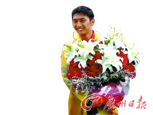 昨天,女子沙灘排球頒獎(jiǎng)儀式在大雨中隆重舉行,之后三對(duì)獲獎(jiǎng)選手陸續(xù)走過(guò)混合區(qū)。此刻,混合區(qū)外邊一個(gè)獨(dú)特的“景致”吸引了大家的注意:一個(gè)高大帥氣的小伙子手捧一束玫瑰,安靜地等待著。他正是田佳在八一沙排隊(duì)的隊(duì)友兼男友鄭鴻勇(見右圖),“本來(lái)不讓他來(lái)看比賽,不過(guò)到了16進(jìn)8的淘汰賽后他非得要來(lái),那我就找來(lái)票給他,每次他都坐在我可以找到的地方!边@也揭開了大家的一個(gè)疑問(wèn),從淘汰賽開始,田佳每贏得一場(chǎng)勝利都會(huì)沖著觀眾席的某一個(gè)方向送出飛吻,原來(lái),她是有“目標(biāo)”的。