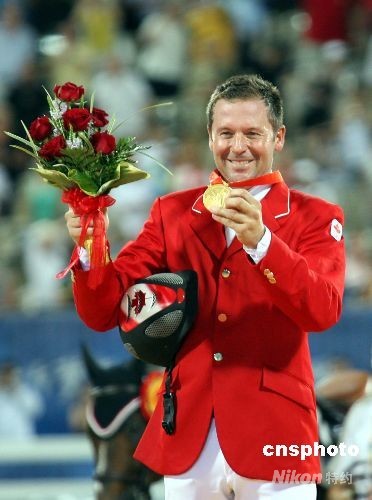 八月二十一日晚,奧運馬術(shù)在香港沙田賽場舉行場地障礙個人賽決賽。加拿大選手埃里克·拉馬茲策騎馬匹“?怂固氐隆壁A得金牌。中新社發(fā) 鄧慶樂 攝