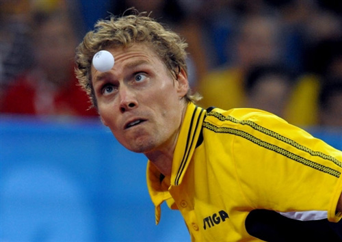 8月22日,瑞典名將佩爾森在奧運乒乓球男子單打四分之一比賽中的發(fā)球聚精會神。