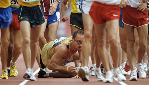 8月22日,北京奧運(yùn)會(huì)田徑男子50公里競走在“鳥巢”進(jìn)行,一位選手在比賽中跌倒。