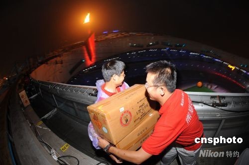 北京奧運(yùn)會閉幕式上的焰火表演將再次為世人奉獻(xiàn)一場華美的視覺盛宴。截止到八月二十二日下午,“鳥巢”煙花燃放已準(zhǔn)備就緒,屆時(shí)將為世人展現(xiàn)有別于開幕式的令風(fēng)姿。圖為負(fù)責(zé)煙火燃放的人員在鳥巢頂上安裝焰火。中新社發(fā) 鐘新 攝