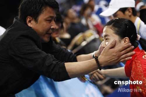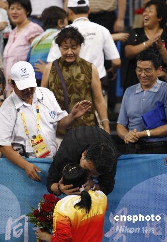 8月22日晚,在北京大學(xué)體育館進(jìn)行的北京奧運(yùn)會(huì)乒乓球女子單打決賽,中國乒乓球老將王楠抱憾負(fù)于隊(duì)友張怡寧獲得銀牌,在現(xiàn)場觀戰(zhàn)的王楠老公郭斌賽后撫慰愛妻。 中新社發(fā) 盛佳鵬 攝