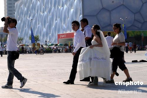 北京奧運(yùn)接近尾聲,一對新人在水立方外拍攝婚紗照片。中新社發(fā) 廖攀 攝