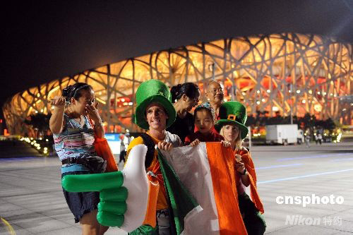 北京奧運接近尾聲,深夜鳥巢外,外國觀眾拿著卡通道具與中國朋友歡樂交流。 中新社發(fā) 廖攀 攝