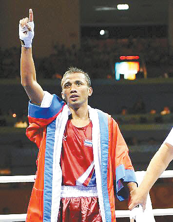 在今天的半決賽中,出場(chǎng)時(shí)的汶尊儂,沉穩(wěn)得像個(gè)書生。在以10∶5的大比分戰(zhàn)勝古巴選手伊格萊西亞斯后,有拳迷向他獻(xiàn)上祝賀的鮮花,他虔誠(chéng)而又恭敬地雙手合十,表示感謝。