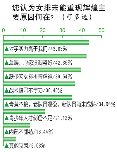本次調查發(fā)現(xiàn),女排敗給對手,43.6%的人認為是對手實力高于我們,42.4%的人認為緣于我們自己急躁,沒有調整好心態(tài)。39.5%的人認為,目前的女排缺少當年老女排的拼搏精神。