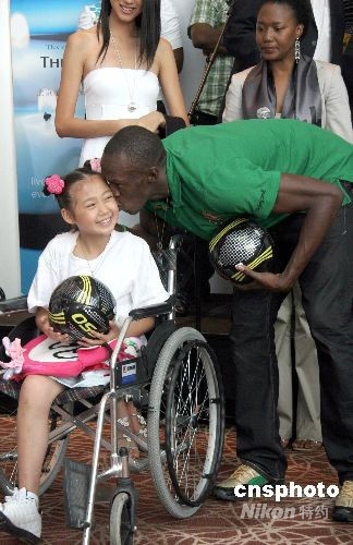 8月23日,北京奧運(yùn)會(huì)田徑一百米、二百米比賽金牌獲得者牙買加運(yùn)動(dòng)員尤塞恩·博爾特親吻來自汶川映秀鎮(zhèn)因大地震受傷的小女孩黃思雨,并向她贈(zèng)送一個(gè)簽名足球。當(dāng)天,博爾特在北京向中國(guó)紅十字基金會(huì)捐贈(zèng)善款五萬美元,以支持中國(guó)紅十字人道救助事業(yè)。中新社發(fā) 孫自法 攝