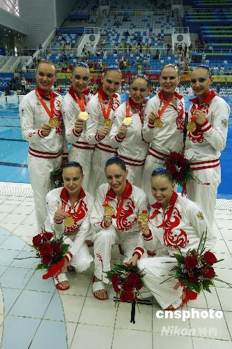 8月23日,俄羅斯花樣游泳隊(duì)在北京奧運(yùn)會集體項(xiàng)目決賽中獲得金牌。中新社發(fā) 杜洋 攝