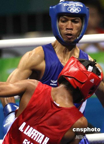 8月23日晚,北京奧運(yùn)會(huì)拳擊決賽在北京工人體育館全面打響。在男子輕蠅量級(jí)(51公斤級(jí))決賽中,經(jīng)過(guò)四個(gè)回合的鏖戰(zhàn),泰國(guó)拳擊手頌集·宗觸霍JONGJOHOR Somjit(藍(lán))以8:2戰(zhàn)勝古巴拳擊手安德里斯·拉菲塔·埃爾南德斯,獲得冠軍。 中新社發(fā) 任晨鳴 攝