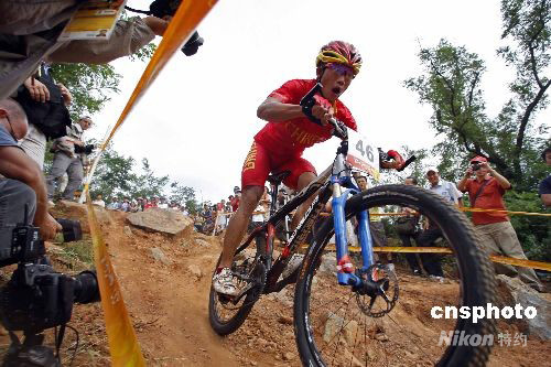 8月23日,在北京老山山地自行車場進(jìn)行的奧運(yùn)會(huì)男子自行車越野賽中,中國選手姬建華名列第22位。中新社發(fā) 盛佳鵬 攝