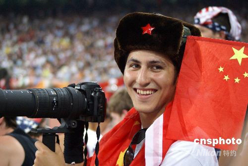 8月23日晚,在國家體育場(chǎng)“鳥巢”的觀眾席上,一位伊朗小伙子頭戴“雷鋒”帽,一邊拍照片,一邊狂熱地為比賽選手助威。當(dāng)現(xiàn)場(chǎng)有觀眾問他姓名時(shí),他微笑著用中文回答“雷鋒”。中新社發(fā) 馬小剛 攝