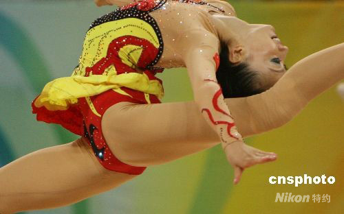 8月24日,中國(guó)藝術(shù)體操隊(duì)在北京奧運(yùn)會(huì)藝術(shù)體操集體全能決賽中奪得銀牌,取得歷史性突破。 中新社發(fā) 武仲林 攝