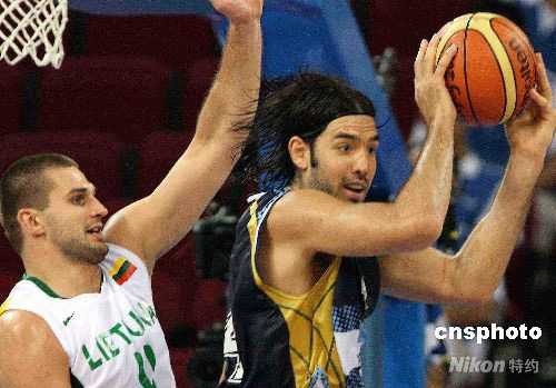 8月24日中午,北京奧運(yùn)會男籃銅牌爭奪戰(zhàn)在五棵松籃球館舉行,雅典奧運(yùn)會冠軍阿根廷隊(duì)在頭號球星吉諾比利缺陣的情況下以87比75戰(zhàn)勝立陶宛隊(duì),獲得本屆奧運(yùn)會銅牌。 中新社發(fā) 任晨鳴 攝