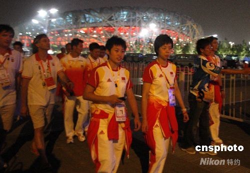 8月24日晚,蟬聯(lián)奧運(yùn)乒乓球女子單打冠軍的張怡寧(右)與隊友郭躍,在北京奧運(yùn)會閉幕式結(jié)束后走出鳥巢。中新社發(fā) 杜洋 攝