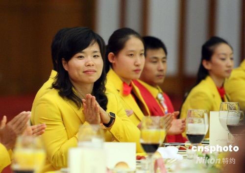 陳艷青參加北京奧運中國體育代表團慶祝宴會。 中新社發(fā) 廖文靜 攝