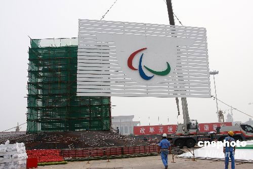 8月28日,北京殘奧會(huì)會(huì)徽開(kāi)始在天安門(mén)廣場(chǎng)安裝。廣場(chǎng)東側(cè),20個(gè)殘奧會(huì)運(yùn)動(dòng)標(biāo)志取代了28個(gè)奧運(yùn)會(huì)運(yùn)動(dòng)標(biāo)志。輪椅橄欖球、輪椅籃球、硬地滾球、自行車(chē)、馬術(shù)等殘奧會(huì)運(yùn)動(dòng)造型初露。中新社發(fā) 追影 攝