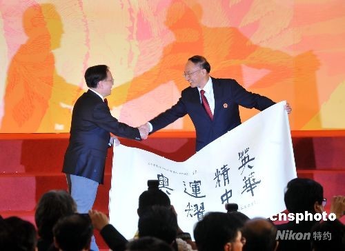 八月二十九日晚,香港特區(qū)政府在會展中心舉行酒會歡迎北京奧運(yùn)會內(nèi)地金牌運(yùn)動員代表團(tuán)訪港。圖為特首曾蔭權(quán)向國家體育總局局長、代表團(tuán)團(tuán)長劉鵬致送一幅國學(xué)大師饒宗頤書寫的“奧運(yùn)精英 光耀中華”字畫。中新社發(fā) 鄧慶樂 攝