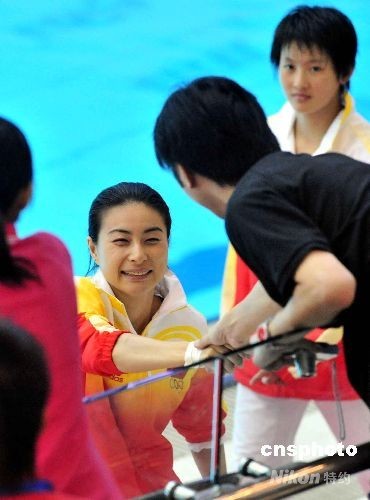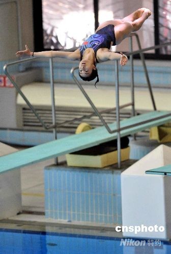 圖為郭晶晶示范三米板跳水。中新社發(fā) 譚達明 攝