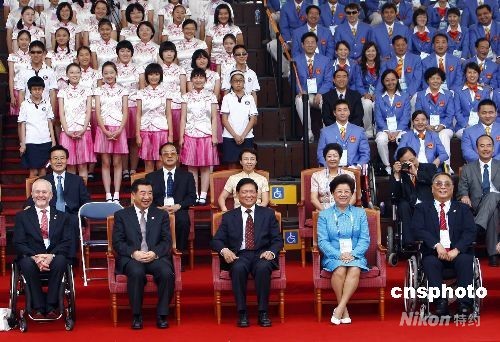 8月30日,北京殘奧村正式開村,中共中央政治局委員、國務(wù)院副總理回良玉(左二),北京奧組委主席劉淇(中),國際殘疾人奧委會主席菲利普·克雷文(左一),全國人大常委會副委員長、北京殘奧村村長陳至立(右二)全國政協(xié)副主席、中國殘疾人聯(lián)合會主席、北京奧組委執(zhí)行主席鄧樸方(右一)出席中國殘奧代表團(tuán)入村儀式。中新社發(fā) 杜洋 攝