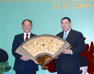 圖:劉鵬向崔世安贈(zèng)送紀(jì)念品。(圖片來源:澳門日報(bào))