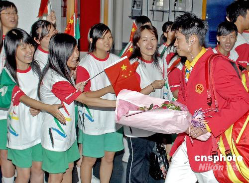 八月三十一日傍晚,北京奧運(yùn)內(nèi)地金牌運(yùn)動(dòng)員代表團(tuán)一行九十三人抵達(dá)澳門,開始為期三天的訪問。中新社發(fā) 澳門新聞局 攝