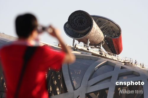 2008年8月31日,工作人員在“鳥(niǎo)巢”上方檢修火炬塔。9月6日,北京殘奧會(huì)主火炬將在國(guó)家體育場(chǎng)“鳥(niǎo)巢”再一次被點(diǎn)燃。 中新社發(fā) 吳芒子 攝