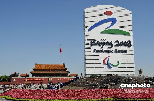 9月1日,北京2008年殘奧會會徽“天地人”屹立在北京天安門廣場。會徽以天、地、人和諧統(tǒng)一為主線,把中國的文字、書法和殘疾人奧林匹克運動精神融為一體,集中體現(xiàn)“心智、身體、精神”和諧統(tǒng)一的殘疾人奧林匹克運動精神,具有深厚的中國傳統(tǒng)文化底蘊。殘奧會開閉幕式將分別于9月6日和17日晚8點在北京的國家體育場“鳥巢”舉行。中新社發(fā) 王宇婷 攝