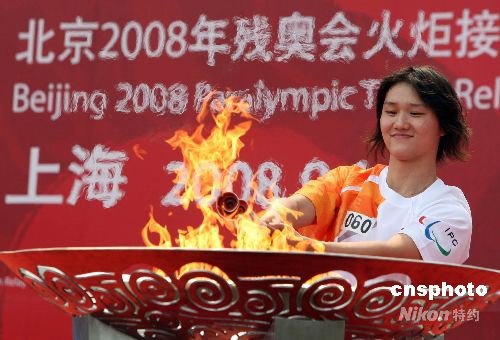九月一日,北京殘奧會火炬接力“時代風采線”第三站傳遞活動,在上海松江新城大學園區(qū)進行,共有六十名火炬手參加。其中,殘疾人員有10名,其余為助殘、幫殘的先進代表和基層殘疾人事業(yè)工作者。在北京奧運會游泳比賽中獲得一銀兩銅佳績的上海運動員龐佳穎,參加火炬接力活動。 中新社發(fā) 湯彥俊 攝