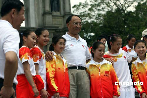 九月一日上午,北京奧運(yùn)內(nèi)地金牌運(yùn)動(dòng)員代表團(tuán)在澳門展開第二日訪問行程,代表團(tuán)團(tuán)長(zhǎng)劉鵬與奧運(yùn)女子體操團(tuán)體金牌選手們?cè)诎拈T著名景點(diǎn)大三巴前留影。中新社發(fā) 洪少葵 攝