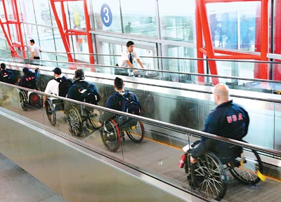 9月1日下午,來自美國的殘奧大家庭成員,坐著輪椅順利通過首都機場內(nèi)的無障礙入境專用通道。