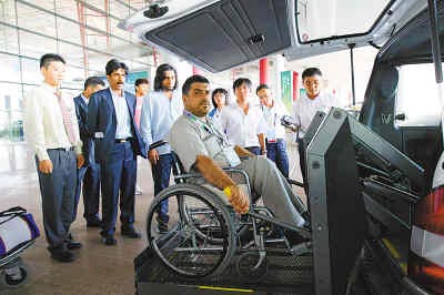 來自阿富汗的殘奧大家庭成員,坐著輪椅通過一個可以遙控的升降平臺登上一輛面包車。