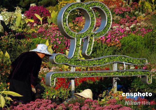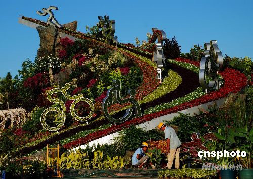 2008年9月1日,20個(gè)殘奧會(huì)運(yùn)動(dòng)造型標(biāo)志亮相北京天安門廣場(chǎng)。據(jù)介紹,今年的廣場(chǎng)擺花是歷史上最長(zhǎng)的一次,分三個(gè)階段制定主題,一直持續(xù)到10月份。中新社發(fā) 楊慧峰 攝