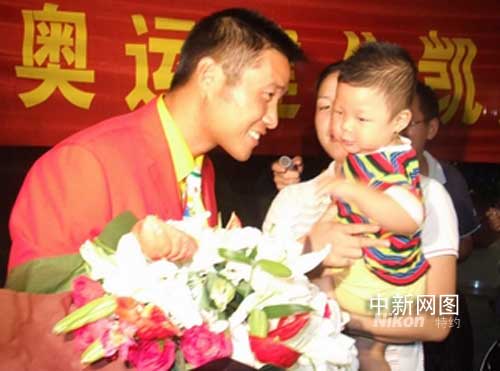 北京奧運(yùn)會(huì)結(jié)束已近十天,妻子徐鋒月一直期盼著丈夫的歸來(lái)。對(duì)于她來(lái)說(shuō),丈夫今晚歸來(lái)也是很突然的!皧W運(yùn)會(huì)結(jié)束后,他還是特別的忙,出席各式各樣的活動(dòng),每天都要忙到十二點(diǎn)才能休息,所以我很少能聯(lián)系上他。直到昨天,他才告訴我今天要回來(lái)!毙熹h月還特意將十五個(gè)月大的兒子帶到了蕭山機(jī)場(chǎng)。