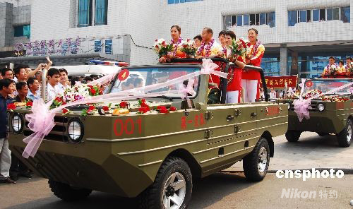 圖:江西以水陸兩棲車迎接奧運(yùn)冠軍凱旋