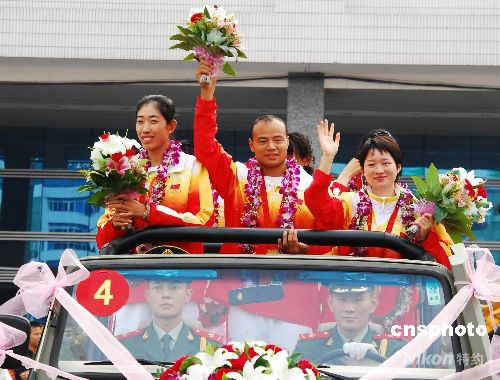 圖為北京奧運(yùn)皮劃艇冠軍楊文軍(中)、跆拳道冠軍吳靜鈺(右)、女子賽艇四人雙槳冠軍金紫薇乘坐水陸兩棲車向家鄉(xiāng)人民致敬。