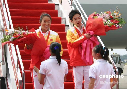 9月3日15時(shí)30分,北京奧運(yùn)會冠軍鄒凱、殷劍在家鄉(xiāng)人民的熱烈歡迎中回到了四川。在2008北京奧運(yùn)會上,來自四川瀘州的鄒凱勇奪自由體操、單杠、男子體操團(tuán)體三枚金牌,來自涼山的殷劍為中國代表團(tuán)拿下了第一枚奧運(yùn)會帆船金牌。中新社發(fā) 霍潺 攝