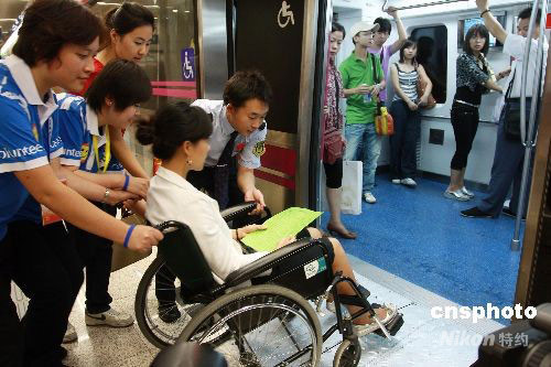 9月3日,在北京主要交通路口、地鐵站、郵局、旅游區(qū)和奧賽場館附近,隨處可見面帶笑容的志愿者們。這一天,是北京殘奧會(huì)志愿服務(wù)的行動(dòng)日。北京燈市口地鐵站點(diǎn)志愿者正在進(jìn)行殘奧會(huì)前的最后演練。殘奧會(huì)期間,乘坐輪椅的殘障人士如需坐地鐵,可提前打電話預(yù)約,到達(dá)地鐵站后有志愿者和工作人員提供一對一式服務(wù)。中新社發(fā) 鄭雄增 攝
