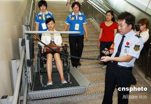 圖為志愿者在北京燈市口地鐵站點進行殘奧會前的最后熱身(演練)。
