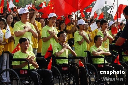 參加北京殘奧會(huì)火炬洛陽(yáng)站傳遞的志愿者,以手語(yǔ)方式“共唱”《感恩的心》。