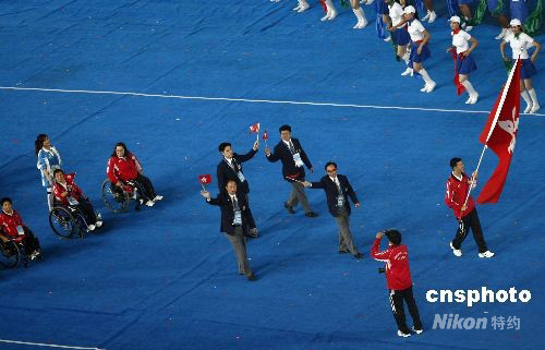 9月6日20時,北京2008年殘奧會開幕式在國家體育場“鳥巢”舉行,圖為中國香港代表團(tuán)入場 。 中新社發(fā) 盛佳鵬 攝