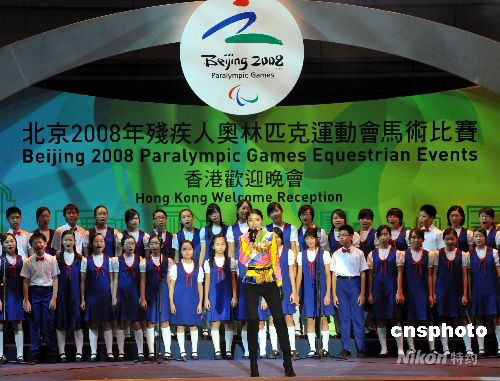 九月六日,北京二零零八年殘奧委會(huì)馬術(shù)比賽開幕式在香港舉行歡迎晚會(huì),香港歌星陳慧琳與香港兒童合唱團(tuán)獻(xiàn)唱為活動(dòng)助興。中新社發(fā) 鄧慶樂 攝