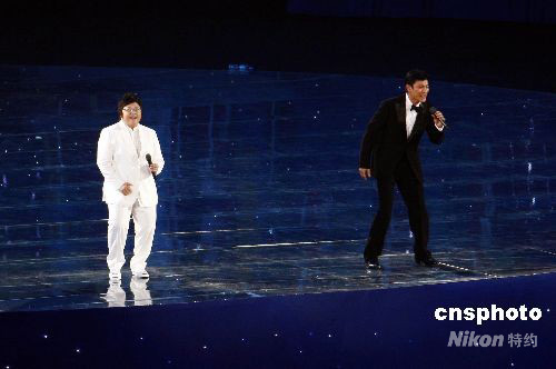 9月6日晚,北京2008年殘奧會(huì)開(kāi)幕式在國(guó)家體育場(chǎng)“鳥(niǎo)巢”舉行,圖為歌手劉德華(右)、韓紅在開(kāi)幕式上演唱?dú)垔W會(huì)主題歌《和夢(mèng)一起飛》。 中新社發(fā) 盛佳鵬 攝