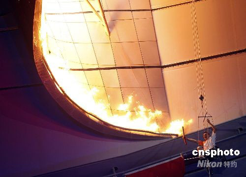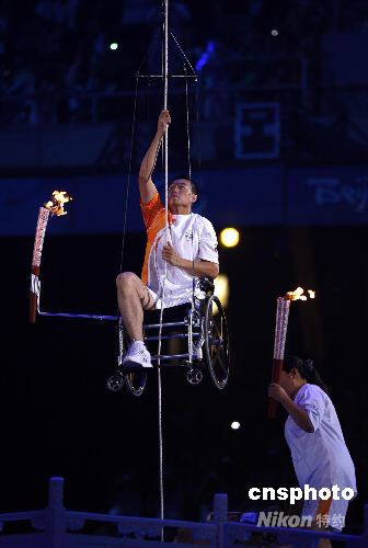 9月6日晚,北京2008殘奧會(huì)開幕式在國家體育場“鳥巢”舉行。 圖為殘奧會(huì)田徑金牌獲得者、最后一棒火炬手侯斌坐在輪椅上,拉繩子攀升至主火炬臺(tái)下,以獨(dú)特方式點(diǎn)燃“鳥巢”上方的主火炬。 中新社發(fā) 杜洋 攝