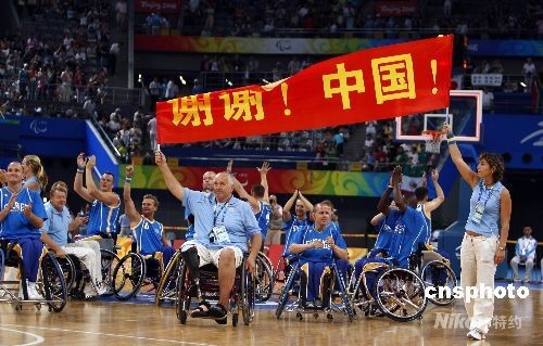 9月7日,北京殘奧會(huì)輪椅籃球比賽中,瑞典隊(duì)在比賽結(jié)束時(shí)打出了“你好,北京!”、“謝謝!中國(guó)!”的標(biāo)語(yǔ)。中新社發(fā) 杜洋 攝