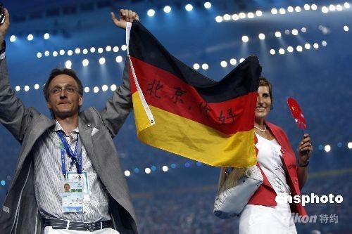 9月6日晚,北京2008殘奧會開幕式在國家體育場“鳥巢”舉行。圖為德國選手入場時展示在國旗上用中文書寫的“北京,你好”。中新社發(fā) 杜洋 攝