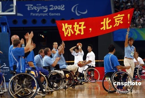 9月7日,北京殘奧會輪椅籃球比賽中,瑞典隊在比賽結(jié)束時打出了“你好,北京!”的標(biāo)語。中新社發(fā) 杜洋 攝